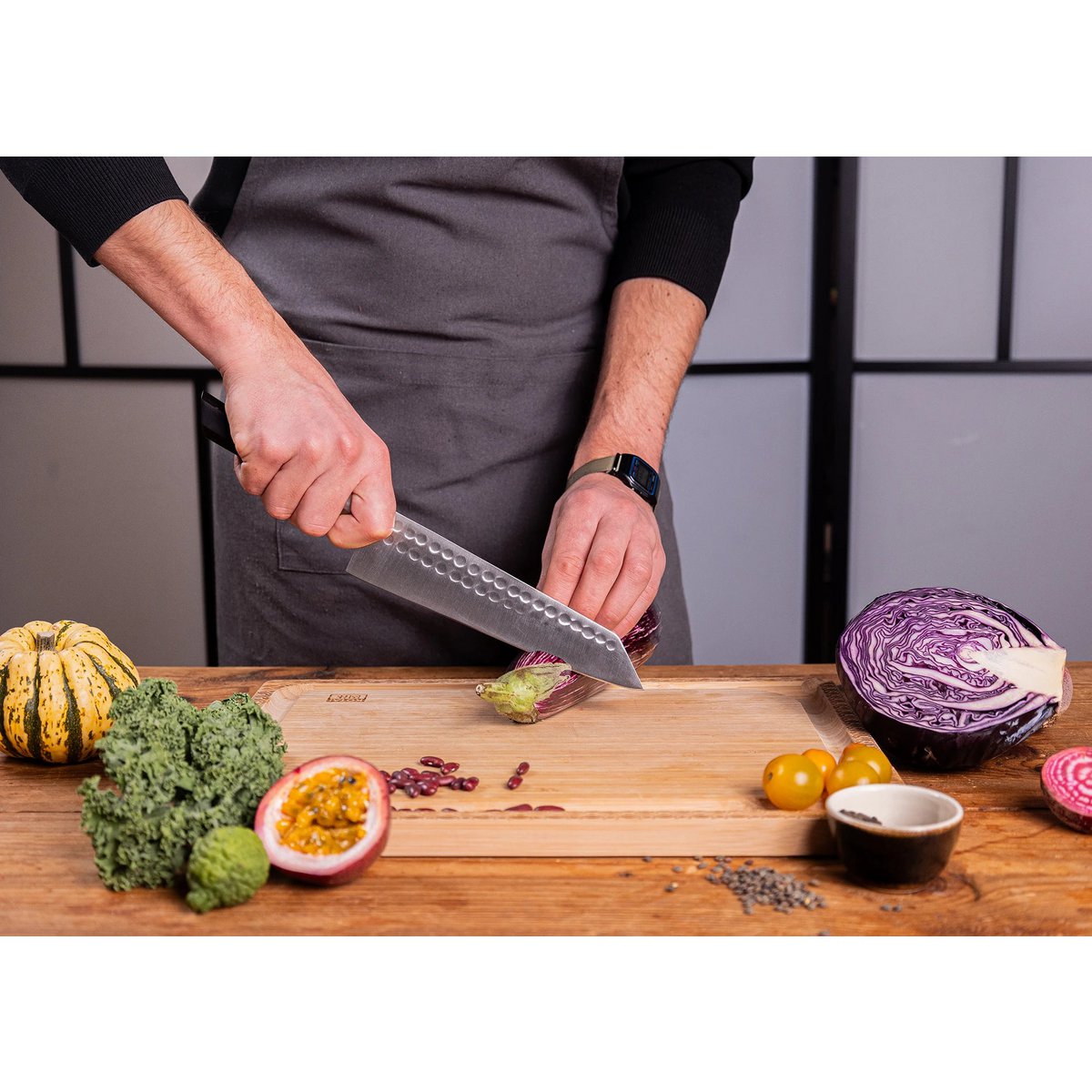 Naast zijn esthetische aantrekkingskracht, creëert het “Tsuchime” (槌目) (gehamerde) patroon kleine luchtbellen tussen het mes en het voedsel dat wordt gesneden. Deze voorouderlijke Japanse methode vermindert de weerstand, waardoor wordt voorkomen dat voedsel aan het mes blijft plakken.